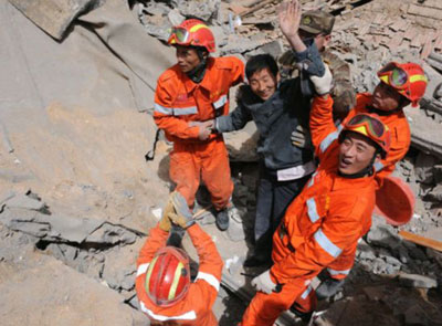 国家救援队在到达玉树机场后,救援队员火速前往受灾最重的玉树县城结古镇。全体救援队员挑灯夜战,齐心协力营救出2名幸存者。虽初战告捷,但救援队员不敢丝毫松懈,因为废墟还有更多生命等待我们。只要有一线希望,我们就会尽百倍努力,“不抛弃,不放弃”。