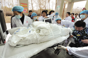 “不抛弃、不放弃”、“一个都不能死,关键是桑珠巴丁绝不能死”、“会诊!会诊!”……桑珠巴丁挺过来了。天津医疗队每一位医生、护士的努力得到了最好的回报。图为天津医疗队救护桑珠巴丁。(记者王晓明)