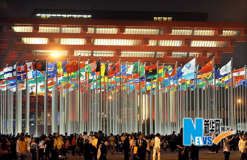 5月2日晚,游客和市民在中国馆前的旗林广场游览。