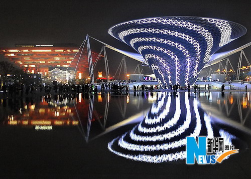 5月2日晚,世博轴“阳光谷”与中国馆的灯光交相辉映。