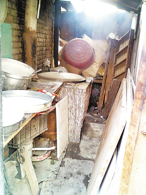“操作间”外用破木板搭建的临路棚屋是“生产间”,用来将生凉皮蒸熟。“生产间”外面尘土飞扬,里面的地面和灶台都是黑乎乎的,“案板”用脏兮兮的破木板搭成。