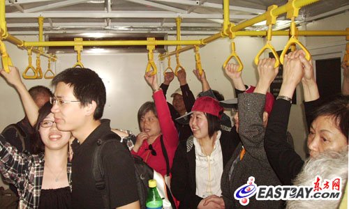 | 黑屋子内被模拟成公交车车厢的模样,每一位进入的体验者都在上方有一个拉环,地震开始时用来保持身体平衡。体验者进入黑屋子后,外面将上锁,整座屋子一下子变得黑漆漆的,更平添了地震将至的恐惧感。 |