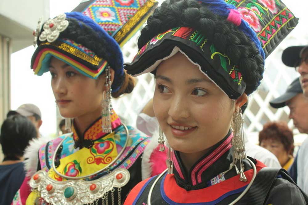 | 5月11日,来自四川地震重灾区的阿坝州茂县的7名羌族“羌花”来到世博园,惊艳的容貌、靓丽的服饰,引得路人纷纷围观。 |