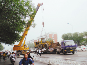 7时45分前后,交警紧急调派吊车到场。经过近半个小时的努力,滑落的挖掘机被吊车吊起,并重新放回到重载挂车上。为保证往来车辆和行人安全,红旗路半幅道路采取机动车临时限行措施。8时25分,肇事的重载挂车被交警带回到指定事故停车场,拥堵近2个小时的红旗路自北向南路段开始放行。