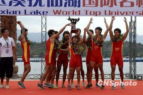 | 2009国际名校赛艇挑战赛,北京大学代表队以明显优势夺得冠军。图为北大代表队队员手捧奖杯、欢庆胜利。 |