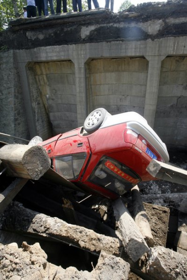 | 锦江大桥桥体虽然坍塌,但桥面的铁板还是一个整体 |