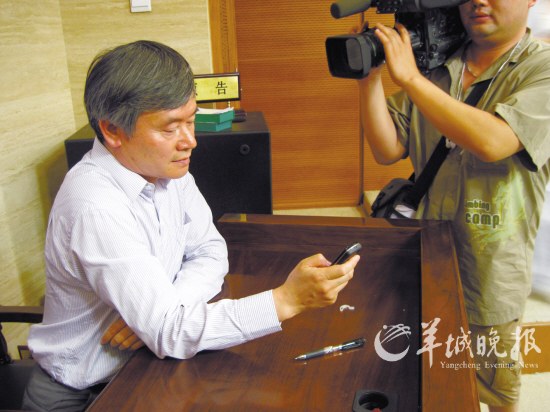 | 昨天在法庭上,蔡继明向媒体展示谩骂他的手机短信 |