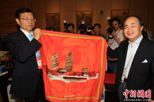 天津北方网讯:6月12日,日本“新遣唐使船”代表拜访世博会中国馆,日本角川财团理事长角川历彦(右)向中国馆馆长徐沪滨赠送“新遣唐使船”图案珍贵丝巾。据介绍,日本重新复制建造千年前的遣唐使船,并让其在上海世博会水域行驶,是续写千余年前中日两国友好交流传奇的重要举措之一。