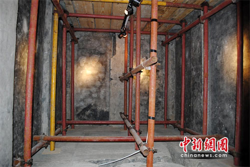 | 17日下午,陕西省公安厅、陕西省文物局在陕西历史博物馆举行移交仪式。经过警方5年多的努力,流失美国的珍贵文物唐贞顺皇后敬陵被盗石椁顺利回归。图为石椁正面。 |