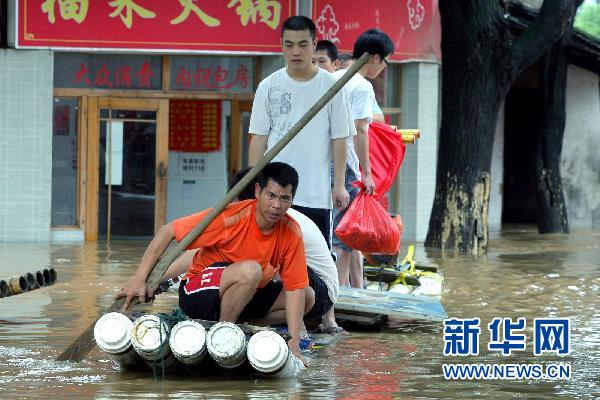 | 6月17日,在桂林市劳动路,居民乘竹筏出行。新华社发(王仲康 摄)。 |