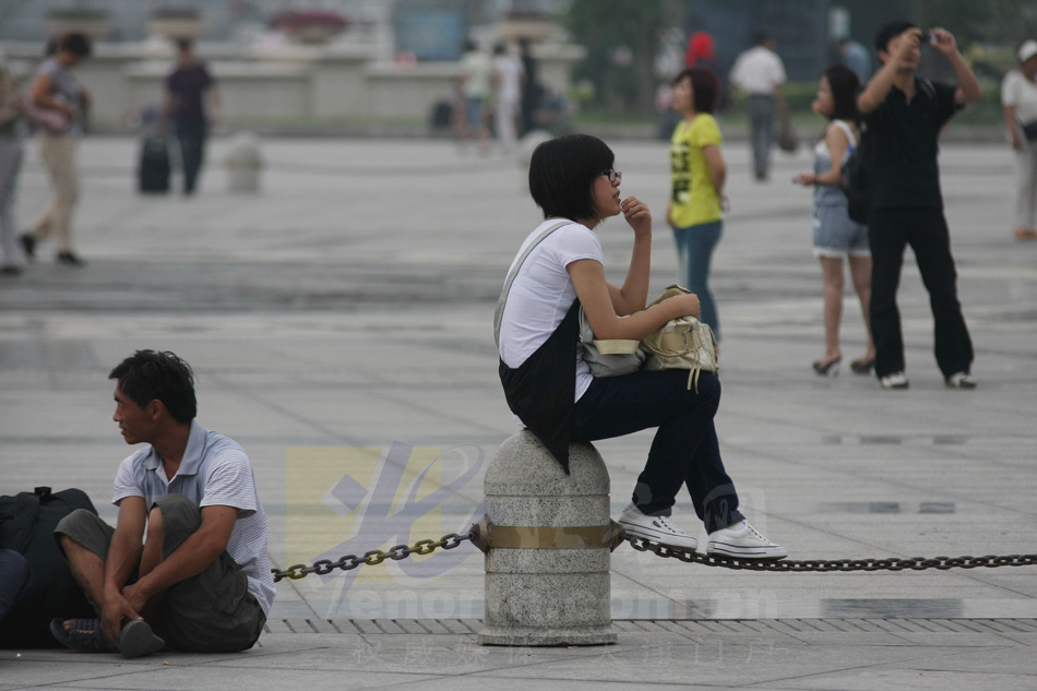 一名学生和一名外来务工人员坐在前广场,此时他们归乡的心情是相同的。