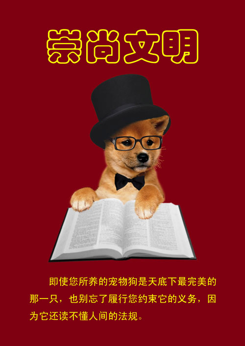 作品说明:首先,以一条尽享人间文明的小狗作为视觉中心以引起人们的注意。以此表明宠物狗已经越来越多地走进人们的生活,它在给人们带来欢乐的同时,也给人们带来了一系列的安全、卫生、扰民等问题。如果大家都站在各自的角度上,强调各自的好恶理由,那么和谐社会里的和谐生活就是一句空话。宠物狗的文明程度是以养狗人的文明程度为前提的。所以养狗的人首先要崇尚文明,这就点明了主题;其次,使用暗红色的背景色增加了一些生活的热烈气息,以减少主体的凝重带给人的压抑感;再次,使用较为耀眼的明黄色和不过分严肃的字体标出主题文字,意在引起人们的关注,同时又给了大家一个较为温和的命题,从而避免了直白的说教。最后,使用较多的文字、较庄重的字体,郑重而又不失诙谐地提醒养有宠物狗的主人们,别忘了文明养狗,以倡导崇尚文明的社会风尚。