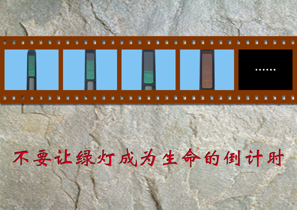 作品说明:以一个闯红灯的人的视觉中心的变化过程为主体,分别记录在了胶片上。第一格:绿灯——启动;第二格:绿灯过半——加速;第三格:绿灯到计时到尾声——再加速;第四格:黄灯——来不及了;第五格:一片漆黑,什么都看不见了,脑子里的想法变成了省略号。它记录了一个或多个生命的到计时。用石头的纹理作背景、用大红色的具有雕刻感的文字点明主题,这都给人以沉重感。意在警醒人们珍爱生命,不要等到生命的信息只能留在胶片上、雕刻在石头上时,才觉醒,那就太晚了。