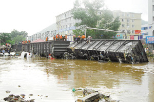28日7时,吉林市境内两处水库溃堤,致使永吉县城遭遇罕见内涝灾害,就在现场,一列货运列车被冲出数百米,20余节车厢被掀翻;水位最高处达18.7米,沿街淤泥达1米多深,数百栋民宅被淹至没顶,部分低矮民房被冲垮。沈阳军区某红军师闻讯紧急出动千余名官兵赶赴现场,目前救援工作正在紧张进行。