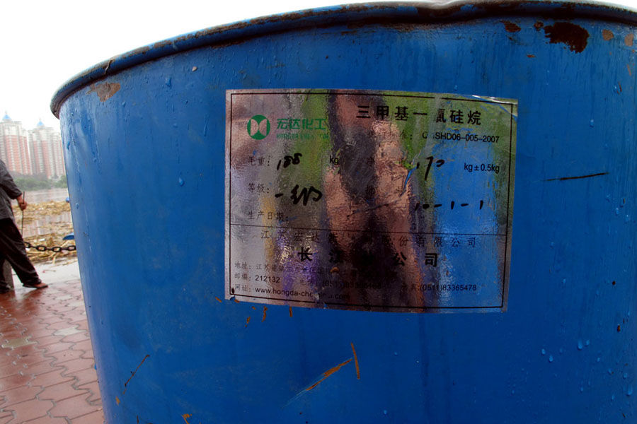 | 7月28日,打捞上来的化工用桶,标有三甲基乙氯硅烷字样。 |