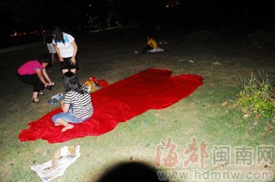 而在广场左侧草坪上,身边带着矿泉水和面包的小何,手里拿着电话不停地拨打着。她说,她是泉州本地人,地震的传言很多,她担心真的发生,就出来到草坪上暂时避下,刚才是在打电话,通知家人到院子里睡觉。