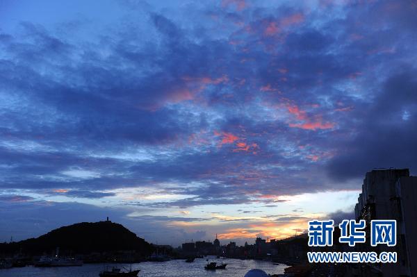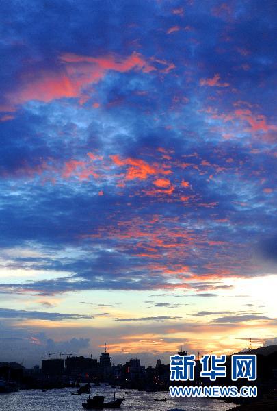 | 8月31日傍晚,浙江省舟山沈家门渔港上空出现少见的“火烧云”景色。 |