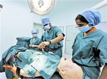 天津北方网讯:今天上午,国内首家旨在培养医学留学生临床技能与实践操作能力的英文模拟医院在天津医科大学落成,可为医学留学生提供全方位的模拟医疗环境,填补了来华留学生全英文临床实践基础设施领域的空白。留学生模拟医院全模仿正规医院建设,占地1500平方米,涵盖内科、外科、妇产科、儿科、ICU、急救门诊及病房检查等多功能教室,涉及无菌术、穿刺、引流、插管、除颤、多病例等模拟训练内容,可为学生提供全方位、全英文的现代化模拟诊疗环境。(记者左山)