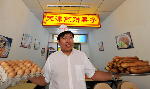 煎饼果子是天津传统风味小吃,天津老百姓的“草根早点”。然而,有多年历史的天津煎饼果子却一直没形成什么气候。如今,西安肉夹馍在全国开分店、永和豆浆在全国挂招牌,外地路边小吃纷纷创出品牌,凭借连锁加盟开遍全国各个城市。天津煎饼果子为什么还没有一个叫得响的品牌?为了把天津传统风味的“天津煎饼果子”做大并最终走出津门,天津金旭集团联合市人力资源和社会保障局中国天津人力资源服务有限公司、天津渤海女子小额贷款股份有限公司,合作开发“天津煎饼果子”项目,三方出台多项举措提供政策和资金支持,促进下岗失业人员以创业带动就业。
