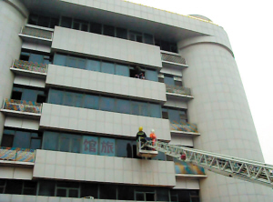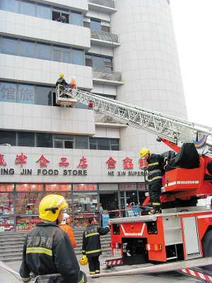 消防员发现,男子所在的5楼距离地面有10多米高,随即又将一辆云梯车调来,让云梯的升降台朝窗台处上升。