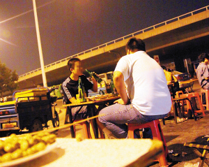 -记者暗访:只要来了多少都会喝点酒23:10左右,记者来到现场,两辆标注“露文”、“银建”的出租车停在烧烤摊旁。两名分别穿着黑、白T恤衫的20多岁男青年下车后,相互打着招呼走到桌子前。很快四瓶啤酒就摆到了他们的桌子上。不到一个小时的时间,四瓶啤酒已经被他们喝去了大半。