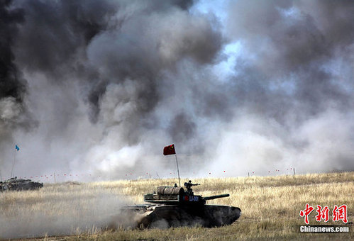 | 9月24日,“和平使命-2010”上海合作组织成员国武装力量联合反恐军事演习战役实施阶段实兵演练,在哈萨克斯坦南部马特布拉克训练场正式举行。图为中方99式坦克在炮火中向预定演习地域推进。 |