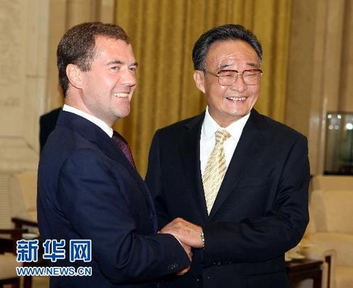 全国人大常委会委员长吴邦国和国务院总理温家宝27日下午在北京分别会见了俄罗斯总统梅德韦杰夫。
