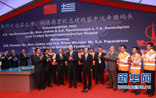 | 10月2日,中国国务院总理温家宝与希腊总理帕潘德里欧一起视察中远比雷埃夫斯港集装箱码头。这是温家宝总理在码头发表讲话。 |