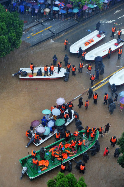 | 该市多个乡镇被洪水围困,文城镇大部分街道被淹,现在车辆基本上无法进入文城镇。文昌的大米店已经脱销,全城停电,蜡烛已断货,食用油无法供货。图为10月8日,官兵在文城镇转移群众。 |