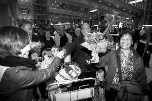 迎接他们的是来自旅行社的鲜花,和家人的拥抱。