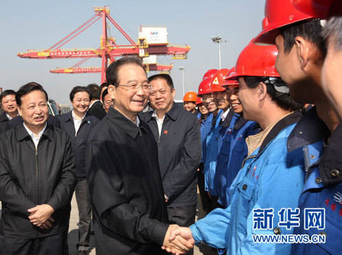 10月22日至23日,中共中央政治局常委、国务院总理温家宝在武汉就当前经济运行情况进行调研。这是10月22日,温家宝在正在建设中的武汉新港阳逻港区亲切看望码头工人和正在卸集装箱的“中远3号”船员。