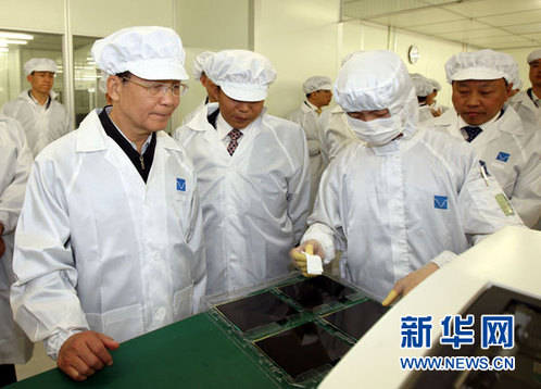 10月22日至23日,中共中央政治局常委、国务院总理温家宝在武汉就当前经济运行情况进行调研。这是10月22日,温家宝在武汉天马微电子有限公司芯片切割和模组车间,仔细了解生产工艺和流程。