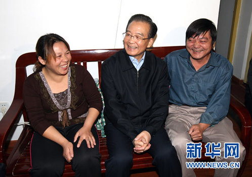 10月22日至23日,中共中央政治局常委、国务院总理温家宝在武汉就当前经济运行情况进行调研。这是10月22日晚,温家宝在武汉市丽华苑小区看望经济适用住房和廉租房住户时,同胡述寿一家亲切交谈。