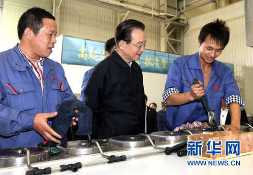 10月22日至23日,中共中央政治局常委、国务院总理温家宝在武汉就当前经济运行情况进行调研。这是10月22日,温家宝在武汉重型机床集团公司大件加工车间调研。