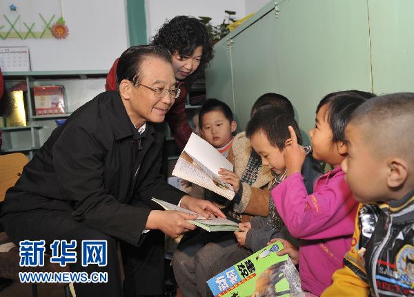 11月2日,中共中央政治局常委、国务院总理温家宝来到北京两所幼儿园就发展学前教育问题进行调研,并与教师和家长们座谈。这是温家宝在北京西城区西柳树井幼儿园与孩子们交流。