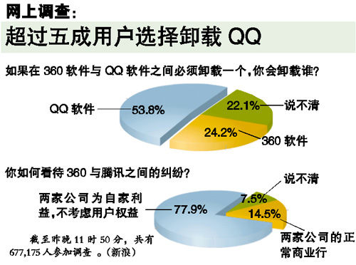 昨晚,腾讯公司通过弹出窗口发表了《致用户的一封信》,宣布“在360公司停止对QQ进行外挂侵犯和恶意诋毁之前,我们决定将在装有360软件的电脑上停止运行QQ软件”。腾讯公司同时表示,把选择软件的权利交给用户。