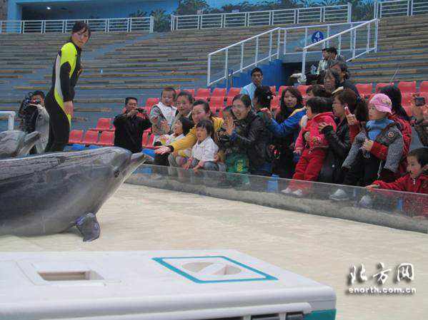 在惊喜声和欢呼声中,孩子们来到了极地海洋世界的欢乐剧场,在这里,四只海豚从水中一跃而起,激起美丽的水花。精彩的表扬,赢得了孩子们的阵阵掌声,聪明的海豚还为大家展示了转呼啦圈的绝技,现场还有两名孩子走到舞台最前方,聆听了海豚美妙的“歌声”,海豚还亲吻了这两名远道而来的小客人。
