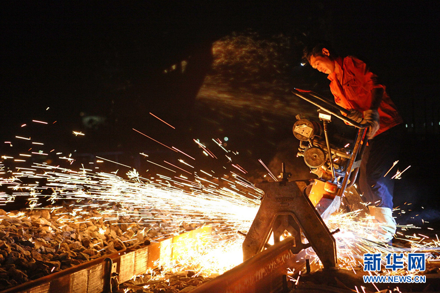| 京九铁路九江长江大桥铁路桥全面换轨完成。2010年8月12日晚,南昌铁路局鹰潭工务机械段的工人在九江长江大桥铁路桥南引桥下行线焊接打磨钢轨。当日,九江长江大桥铁路桥更换钢轨工作顺利完成。位于长江中下游的九江长江大桥于上世纪90年代建成通车,为双层双线铁路、公路两用桥。自今年5月开始,九江长江大桥铁路桥自通车后首次进行全面更换钢轨,大桥上、下行线路共计16公里的钢轨全部进行更换,线路质量和稳定性将全面得到提升。 |