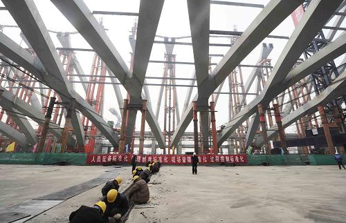 11月18日,施工人员在实施主体结构封顶的天津西站站房内紧张工作。新华社记者岳月伟摄