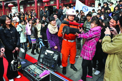 公安消防南开支队结合“消防宣传月”活动,于日前在古文化街举办“消防运动会”,许多商家店员、市民穿上消防服,通过救助伤员、施放消防水带接枪头、携带灭火器跑等比赛,亲身体验消防工作,有效增强了防火意识和自救能力。图为消防队员正在向市民展示消防装备。