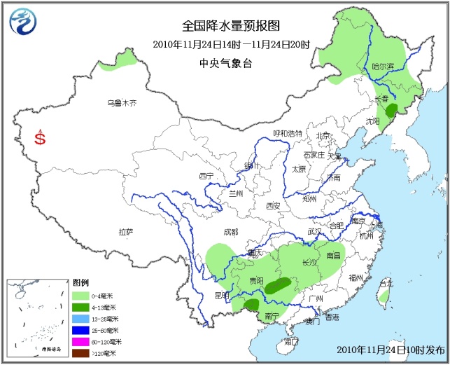 | 今天14时至20时,新疆北部山区、内蒙古东北部、黑龙江大部、吉林大部、辽宁东部等地有小到中雪(雨)或雨夹雪;四川南部、云南东部、贵州、湖南、江西大部、广西大部、台湾南部等地有小到中雨或阵雨。 |