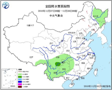 27日08时至28日08时,东北地区北部有小到中雪;西南地区东部、江南西部、广西西部等地有小到中雨。