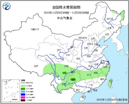 28日08时至29日08时,黑龙江东北部有小雪;江南、西南地区东部、西藏东部有小到中雨。