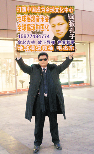 毛杰东站在闹市区,手举大牌子,上面“叫板孔子”四个字分外扎眼。他认为,在中国文化的传播上,孔子并不“称职”。他举例说,足球的雏形蹴鞠早在春秋战国就在中国出现,作为当时最伟大的思想家、教育家,孔子没有将足球文化推广开来,导致足球运动在西方发扬光大。而他要在中国举办全球摇滚音乐会,承担起文化推广重任,通过摇滚乐将中国打造成全球文化中心,走遍各大城市就是为其做宣传。“很多人说我是疯子,但这是我的目标!”男子坦言,“叫板孔子”不过是其想出来的噱头,想为全球摇滚演唱会带来人气,面对炒作的质疑,他并不讳言。