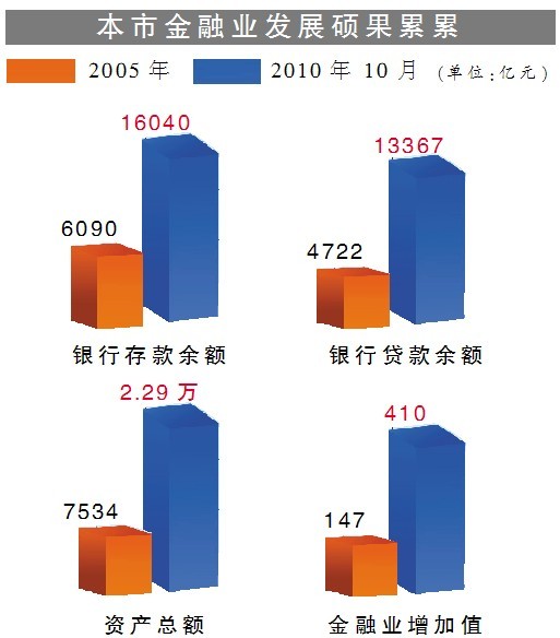 改革创新,让本市金融业发展结下了累累硕果:2005年至今年10月份,银行存款余额由6090亿元增至16040亿元,增长163%;贷款余额由4722亿元增至13367亿元,增长183%;资产总额由7534亿元增至2.29万亿元,增长204%;金融业增加值由147亿元增至410亿元,占国内生产总值比重由3.8%上升到6.3%。(记者 马波 白俊峰)
