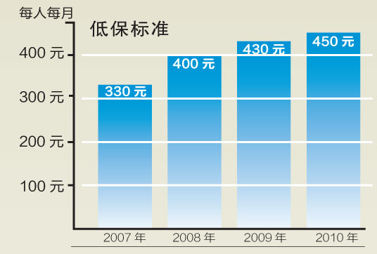 2009年,低保标准又调整为每人每月430元,一家人总计1290元。