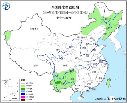 7日08时至8日08时,新疆西南部、内蒙古中东部、黑龙江中东部和南部、吉林、辽宁中东部等地的部分地区有小到中雪或雨夹雪;四川南部、重庆南部、贵州大部、云南、广西西部及台湾等地的部分地区有小到中雨或阵雨。内蒙古中西部、江南中东部、华南东部的部分地区有4~6级风;南疆盆地、内蒙古西部的部分地区有扬沙或浮尘。台湾海峡、台湾以东洋面和以南海域、南海东北部海域将有8~9级、阵风10~11级的东北风;东海南部海域、南海西北部、中部和西南部海域、北部湾将有7~8级、阵风9级的东北风。