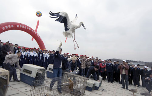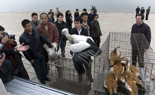 当天,天津市野生动物保护中心在蓟县于桥水库放飞一批珍稀候鸟,包括白鹤、东方白鹳等国家一级保护动物2只,白天鹅、赤麻鸭等国家二级保护动物14只。这些珍稀候鸟都是迁徙途中不幸受伤后被好心市民救助,送往天津市野生动物保护中心的。经抢救治疗和精心饲养,这些候鸟均已恢复健康。新华社发(王广山摄)