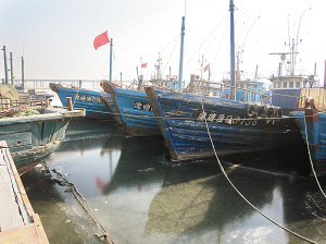 近日来的连续低温使得北塘渔港附近的海冰冰层越来越厚,据相关部门监测,目前北塘渔港处的海冰厚度已达15厘米左右。昨天上午,记者来到北塘,近百条渔船整齐地排列在码头沿海,已经被海冰冻住,动弹不得,但船身笔直,并未出现去年那种倾斜、受挤的情况。