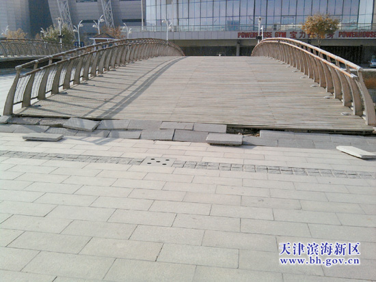 随后,记者赶到了现场。在广场上看到,很多阶梯、小木桥周边的地砖已经残破不堪而脱落,在一些地砖已经脱落掉的阶梯上,钢架清晰可见,脱落掉的地砖早已不见了踪影。广场地面上有多处地砖也纷纷翘起,有些砖块还被人特意垒叠到了一起摆在路中央。